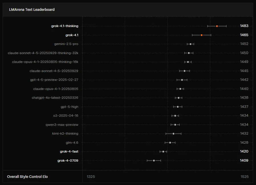 xAI calls this an “instant‑response experience,” and benchmarks back that up. In the LMArena Text Arena leaderboard, Grok 4.1’s "Quasarflux" reasoning mode achieved an Elo score of 1483, taking the top position — a full 31 points higher than any non‑xAI model. Even its non‑reasoning “Tensor” mode, built for lightning‑fast answers, scored 1465 — still outperforming fully‑reasoning competitors.