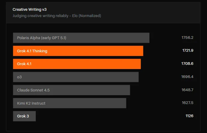 Beyond data crunching, Grok 4.1 shows remarkable sophistication in creative writing and storytelling. In the Creative Writing v3 benchmark, both Grok 4.1 modes placed in the top 3, overtaken only by a private, experimental GPT‑5.1 build. This performance showcases Grok 4.1’s impressive balance of algorithmic reasoning and imaginative flair — an important trait for writers, marketers, and AI content creators.