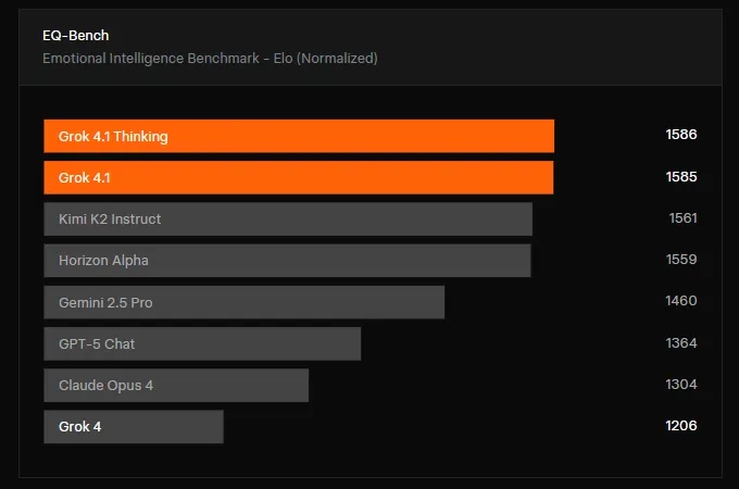 When tested on EQ‑Bench3, which measures empathy, insight, and social awareness across 45 scenario‑based conversations, Grok 4.1 ranked first and second among all LLMs.